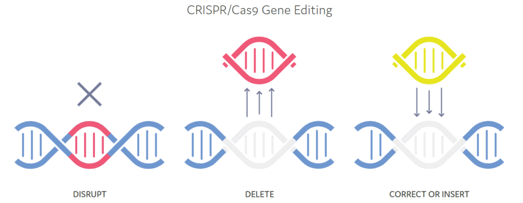 - Correction/insertion: främmande genetiskt material kan sättas in i genomet. Ett DSB skapas och cellen luras att tro att det främmande DNA-materialet härstammar från den homologa kromosomen och använder det som mall för reparation, så kallad HDR (Homology Directed Repair).